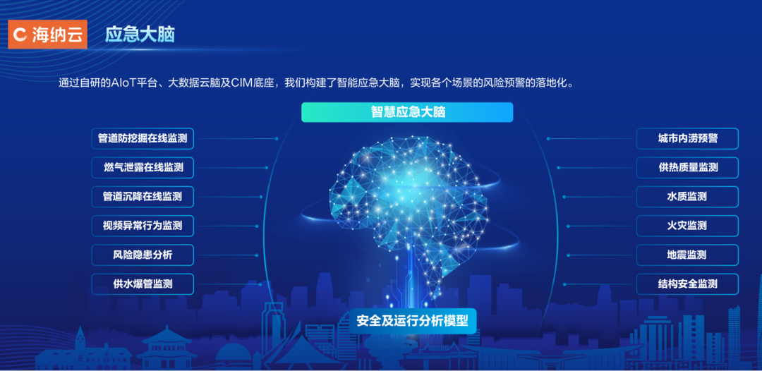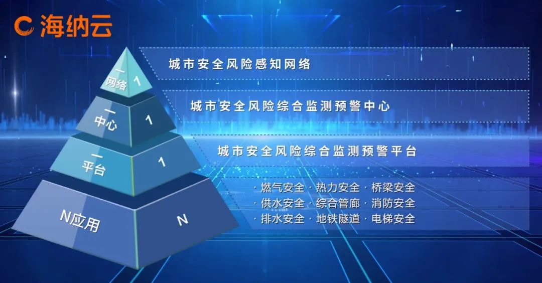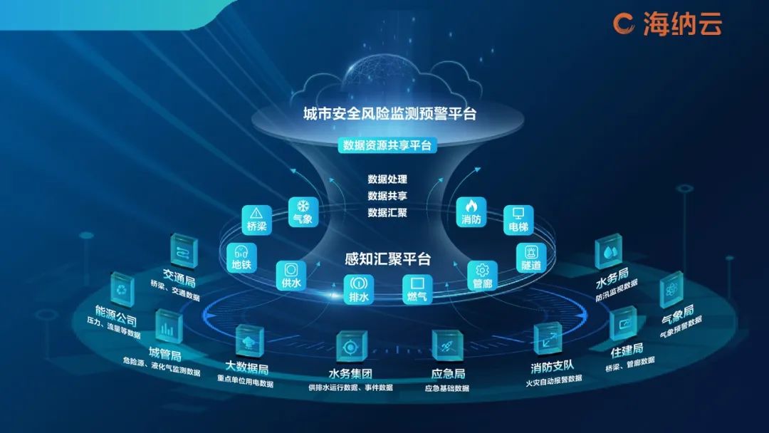 在城市级监测预警方面,海纳云立意打造综合性、全方位、系统化的城市安全风险综合监测预警体系,以自研AIoT平台、大数据云脑及CIM底座为底层技术能力支撑,通过搭建“一网”(城市安全风险监测感知网)、“一中心”(城市安全风险综合监测预警中心)、“一平台”(城市安全风险综合监测预警平台),让管理者全面掌握城市各领域风险要素,清楚“哪里有问题、有什么问题、如何解决问题”,此模式已在“青岛市城市安全风险综合监测预警平台试点建设项目”中得到落地应用。