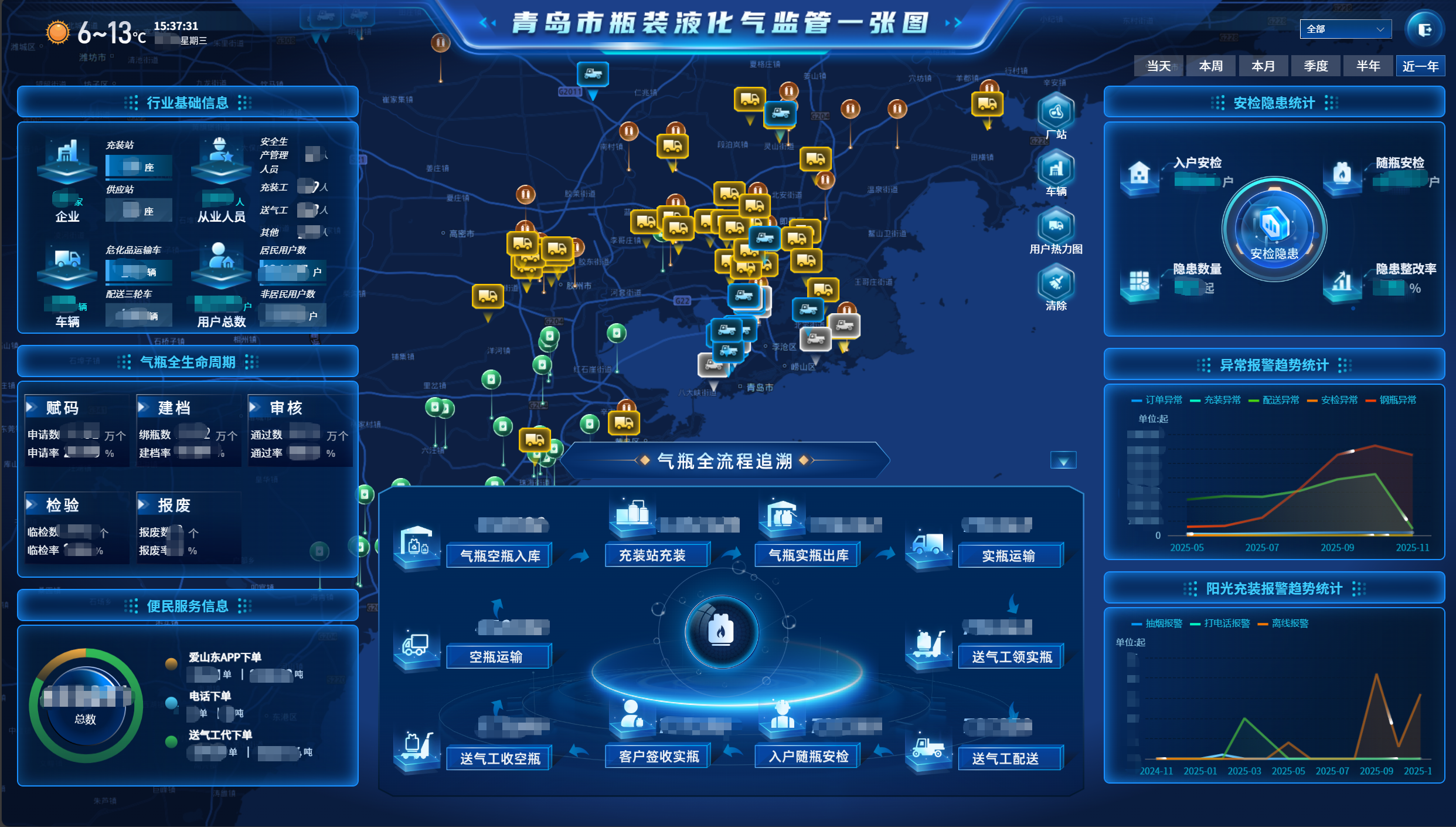 针对液化气企业数量多、规模小、分布散,人、车、瓶底数不清,企业管理不规范等问题,海纳云打造的样板项目“青岛市智慧燃气管理服务系统液化气监管子系统”,率先打通城市管理、市场监管、交通运输等相关部门及40余家液化气企业的业务系统,实现企业、气瓶、人员、车辆等各维度数据的实时汇聚与智能分析,构建液化气行业基础信息“一本账”。系统上线后,青岛市液化气行业基础信息准确率提升至99.9%,跨部门协同监管效率大幅提升。
