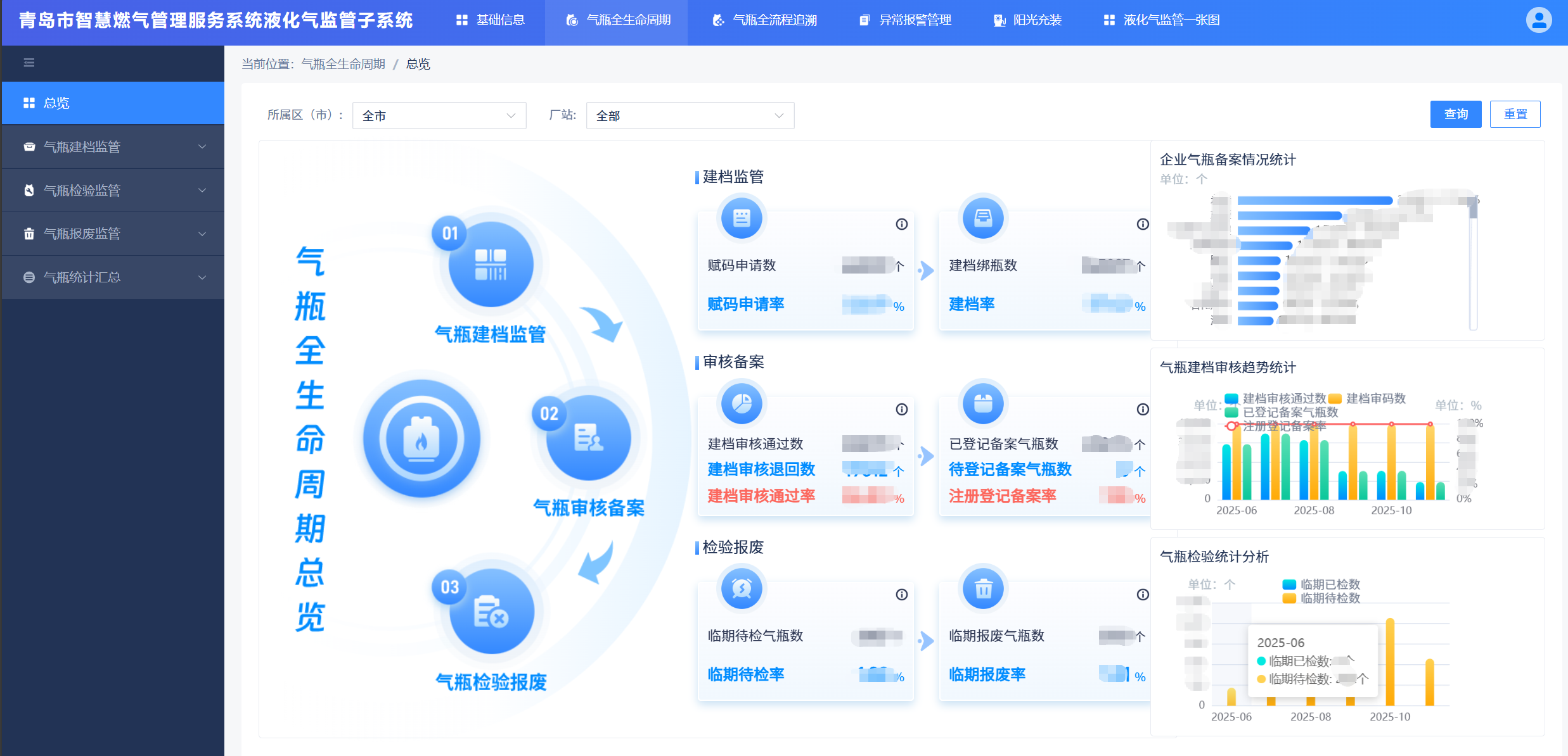 同时,针对传统气瓶“档案不实、超期服役、流向不明”等安全隐患,海纳云创新建立气瓶全生命周期管控机制,在建档监管、审核备案、检验报废三大环节设置12项管控指标,对全市87万只钢瓶实施“旧瓶赋新码、一瓶一身份、一码管终身”管理,实现气瓶“生老病死”全流程动态追踪。通过该机制,青岛市超期服役气瓶检出率达100%、不合格钢瓶无法充装,从源头杜绝不合格气瓶流入市场。
