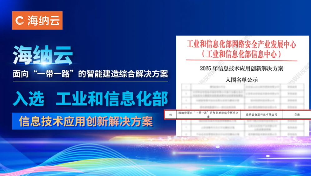 近日,工业和信息化部信息中心公布2025年信息技术应用创新解决方案名单,海纳云“面向一带一路的智能建造综合解决方案”成功入选。该方案在全国1219个申报项目中脱颖而出,成为最终入选的156个解决方案之一,充分体现其方案在技术创新、应用落地与行业引领上的顶尖水准。