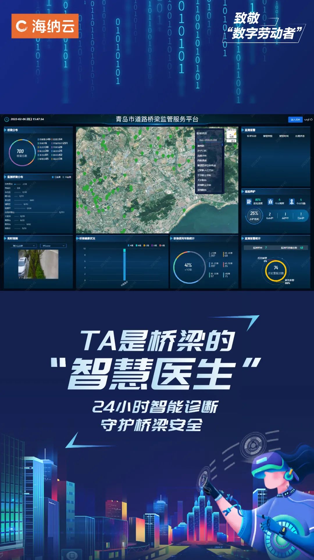 海纳云通过搭建青岛市道路桥梁监管服务平台,打破了桥梁养护的信息壁垒,让全市桥梁管理实现了“一平台、一张网、一个APP”,也让青岛成为全省唯一一个拥有接入全部桥梁信息智慧管理平台的城市。通过这位“智慧医生”,桥身倾斜变形,支座位移、应力发生变化……这些都可以被24h实时监测并智能预警;桥梁管理员通过手机可以实时查看桥梁的动态,并定期生成“体检报告”,管养工作从此智能高效。