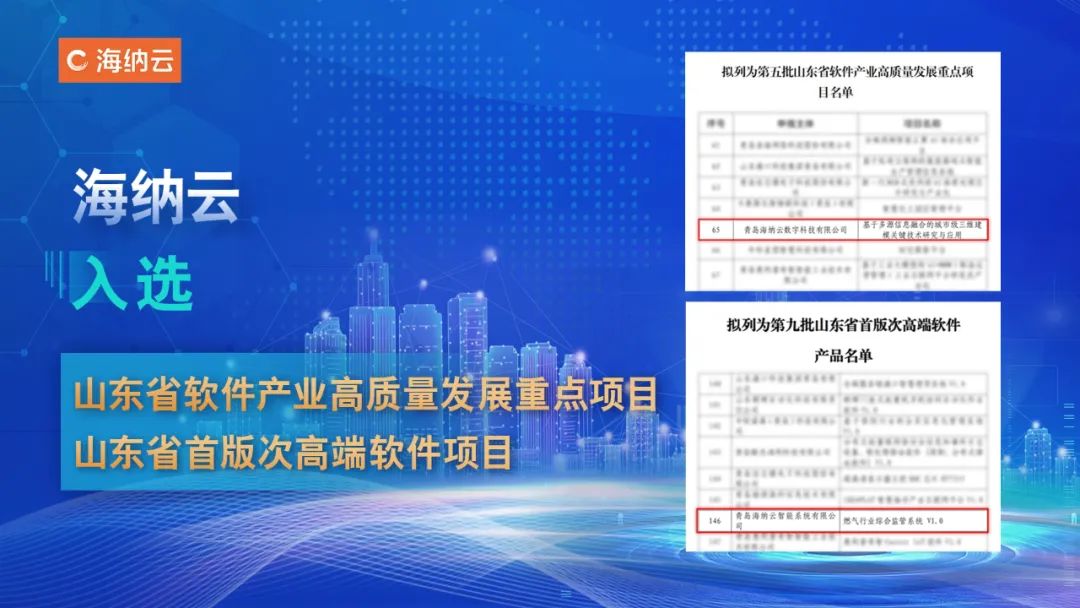 近日,山东省工业和信息化厅公布了“第五批山东省软件产业高质量发展重点项目名单”、“第九批山东省首版次高端软件项目名单”,海纳云“基于多源信息融合的城市级三维建模关键技术研究与应用”和“燃气行业综合监管系统V1.0”荣耀登榜,彰显了其领先的技术实力。