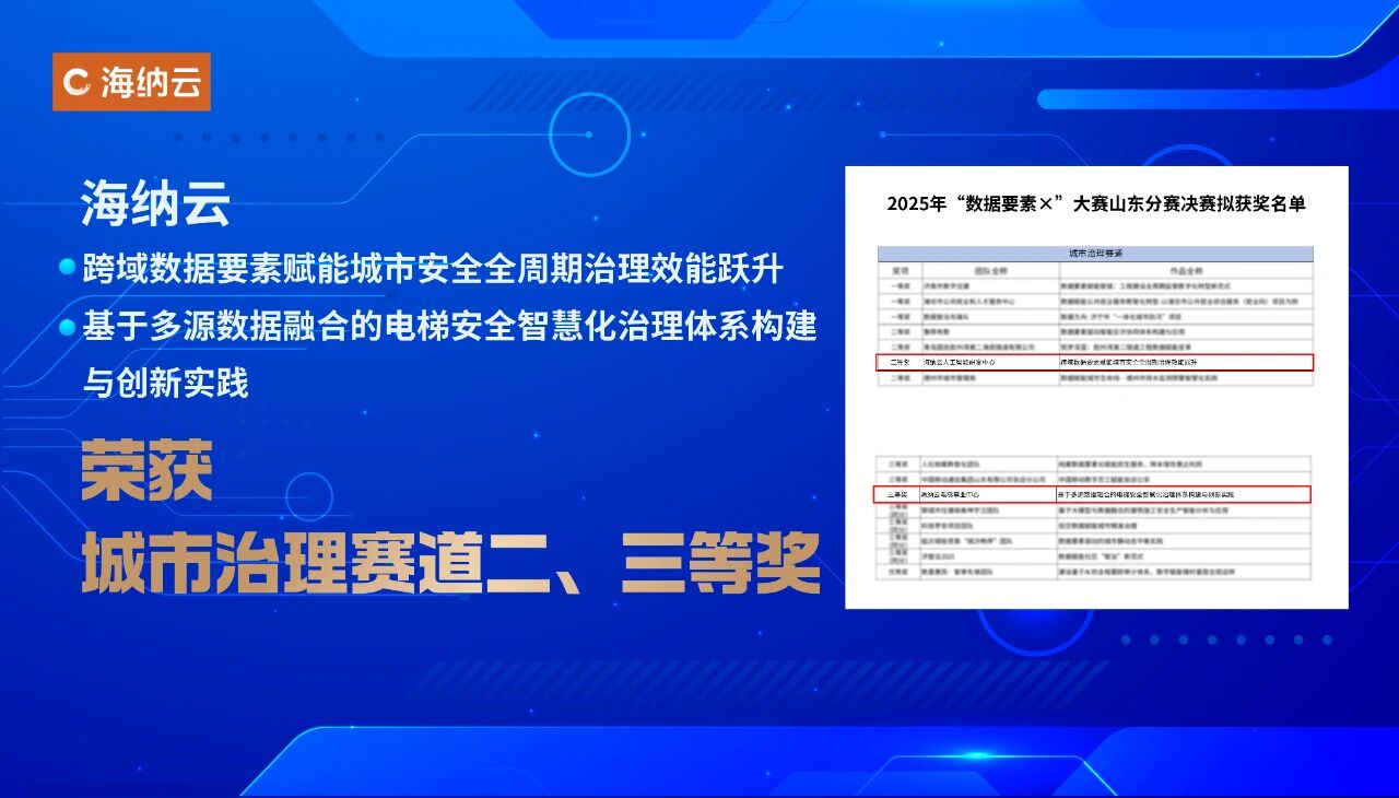 近日,2025年“数据要素×”大赛山东分赛决赛落下帷幕。海纳云凭借“跨域数据要素赋能城市安全全周期治理效能跃升”和“基于多源数据融合的电梯安全智慧化治理体系构建与创新实践”两项成果斩获城市治理赛道二、三等奖。