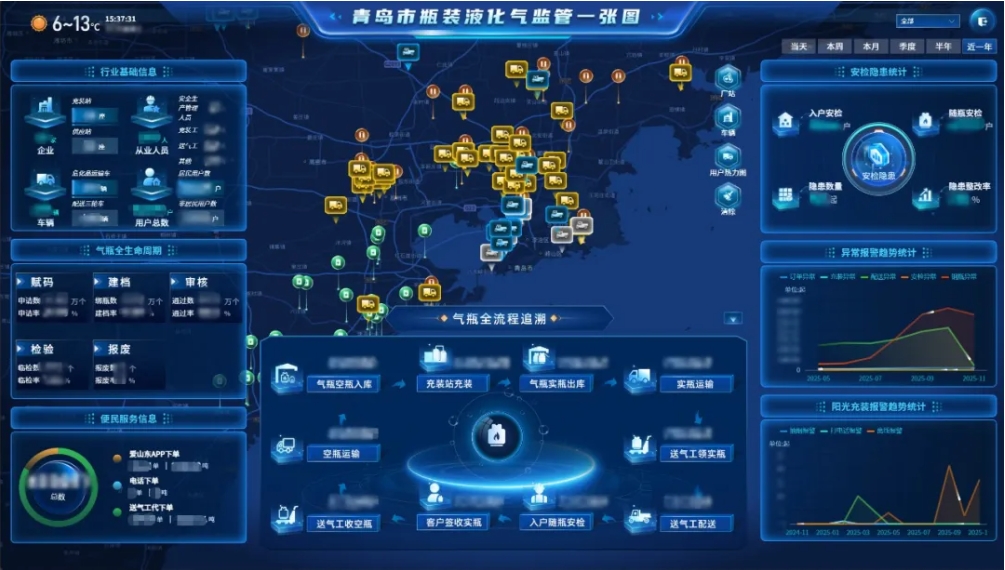 海纳云针对青岛瓶装液化气行业特点,创新构建“全生命周期+全流程追溯”融合管理模式。为青岛量身打造的瓶装液化气监管一张图率先打通城市管理、市场监管、交通运输等多部门及数十家液化气企业业务系统,实现企业、气瓶、人员、车辆等各维度数据实时汇聚,构建行业基础信息“一本账”, 让青岛市液化气行业基础信息准确率提升至99.9%,跨部门协同监管效率大幅提升。